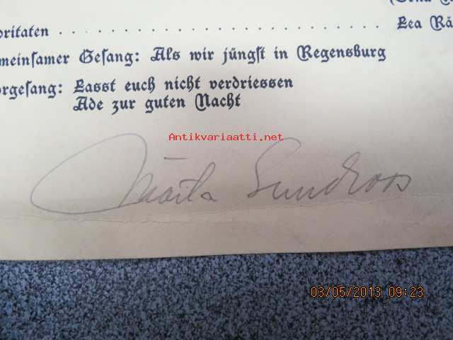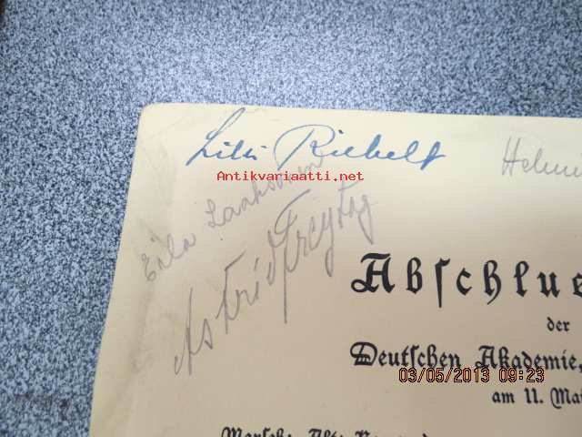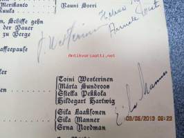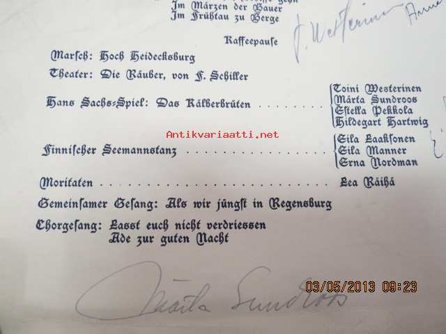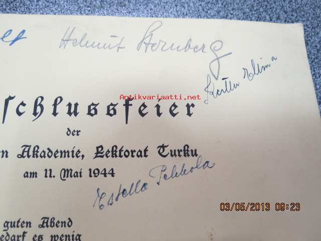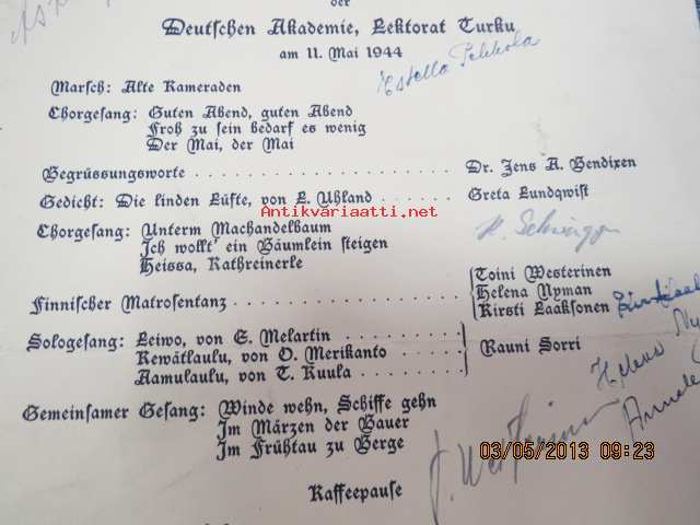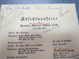 Abschlussfeier der Deutschen Akademie, Lektorat Turku am 11. Mai 1944 -päätösjuhlan ohjelma, allekirjoituksia mm. Astrid Freytag, Kerttu Elima, Estella Pekkola,