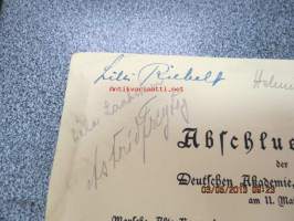 Abschlussfeier der Deutschen Akademie, Lektorat Turku am 11. Mai 1944 -päätösjuhlan ohjelma, allekirjoituksia mm. Astrid Freytag, Kerttu Elima, Estella Pekkola, Annela West, Eila Manner, Marita Lindroos, Helena Nyman