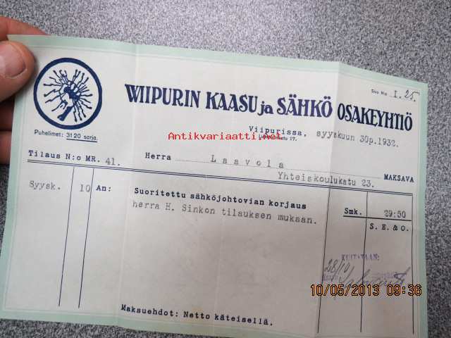 Wiipurin Kaasu ja Sähkö Osakeyhtiö -laskulomake 30.9.1932