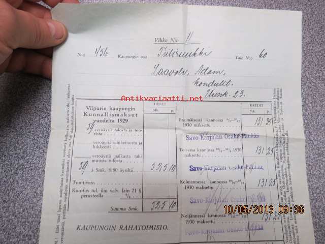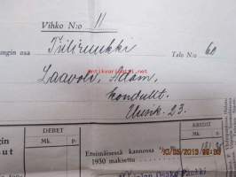 Viipurin kaupungin kunnallismaksut v. 1929 Tiiliruukki talo nr 60 -lasku