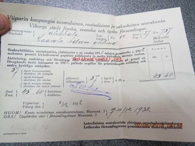 Viipurin kaupungin suomalainen, ruotsalainen ja saksalainen seurakunta, Adam Laavola, Talikkala -kirkollisverokuitti 1932