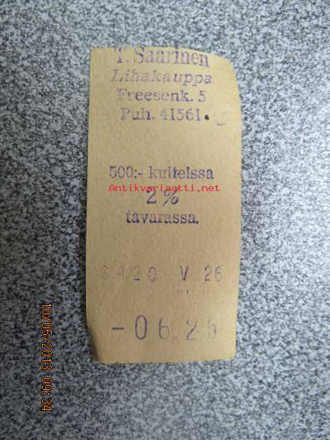 Lihakauppa T. Saarinen, Freesenkatu 5, Viipuri -kassakuitti