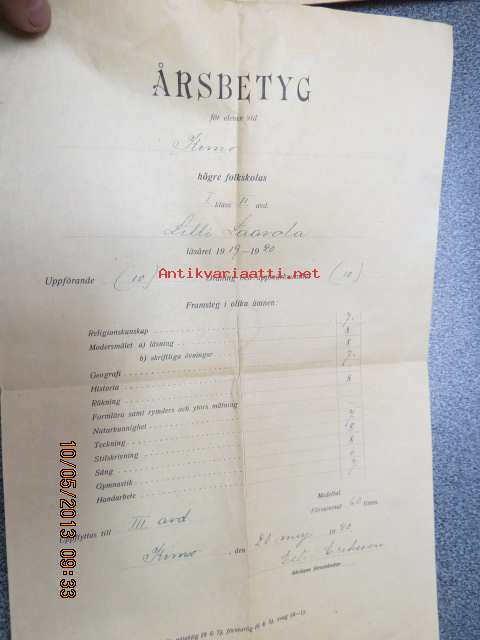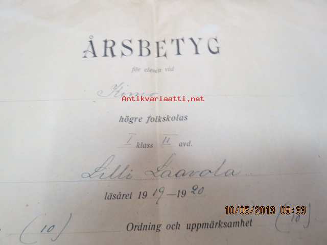 Årsbetyg för eleven vid Kimo (Vasa) högre folkskolas I klass Lilly Laavola läsåret 1919-1920