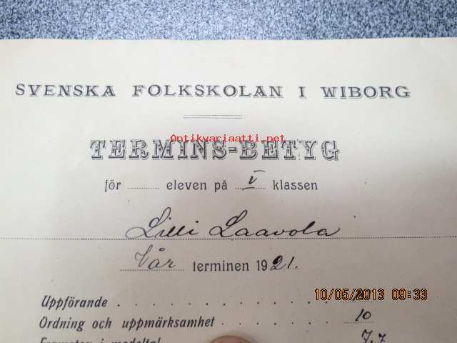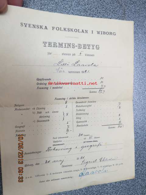 Svenska Folkskolan i Wiborg (Viipuri) - Termins-Betyg för eleven Lilly Laavola vårtermin 1921