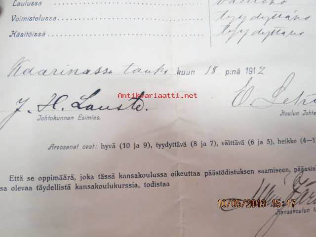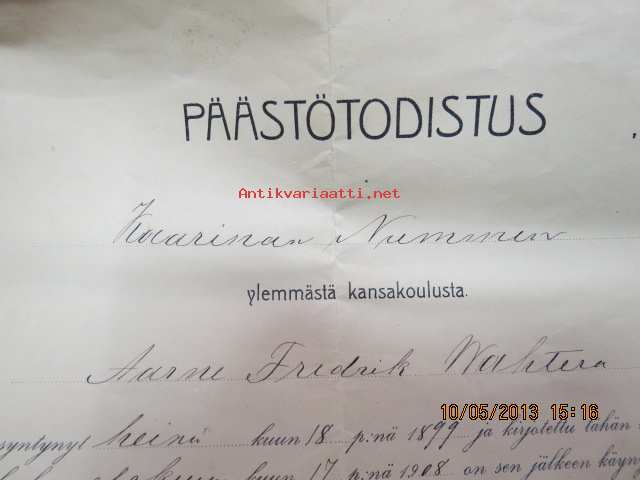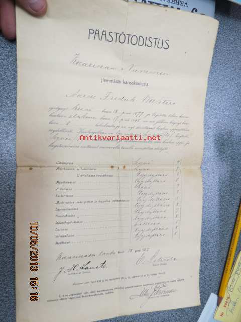 Päästötodistus Kaarinan Nummen ylemmästä kansakoulusta Aarne Fredrik Wahtera 1912