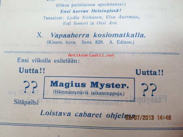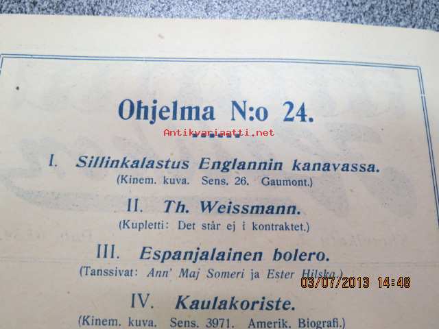 Helikon, Kluuvikatu 2, Helsinki elokuva- / operettiteatteri - Ohjelma nr 24 mm. Sillinkalastus Englannin kanavassa -kinematografinen kuva, sens. nr 26, Gaumont ,