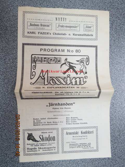 Maxim P. Esplanadikatu 39, Helsinki; Järnhanden - Flykten från Pagnon - Kriminaldrama i 3 afdelningar, kinematografisk bild, sensur nr 4177, längd 1150 m, Gaumont-film -käsiohjelma ruotsiksi