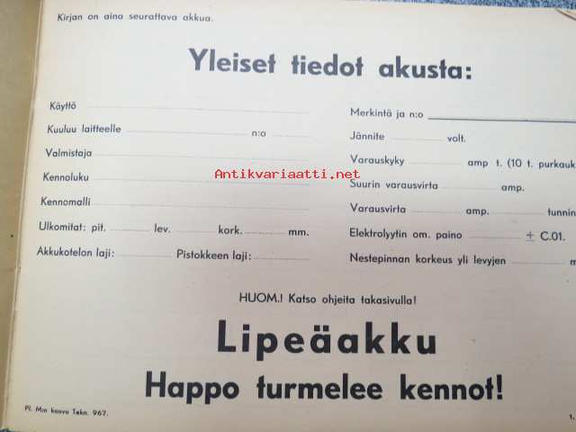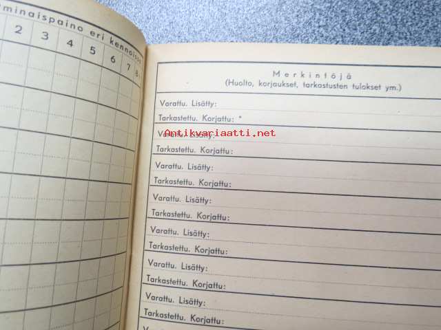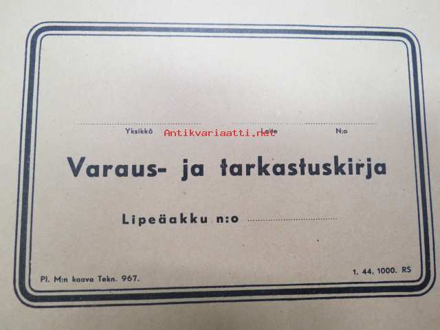 Varaus- ja tarkastuskirja lipeäakku nr -sota--aikainen kalustopäiväkirja, käyttämätön