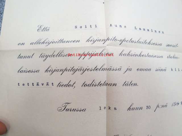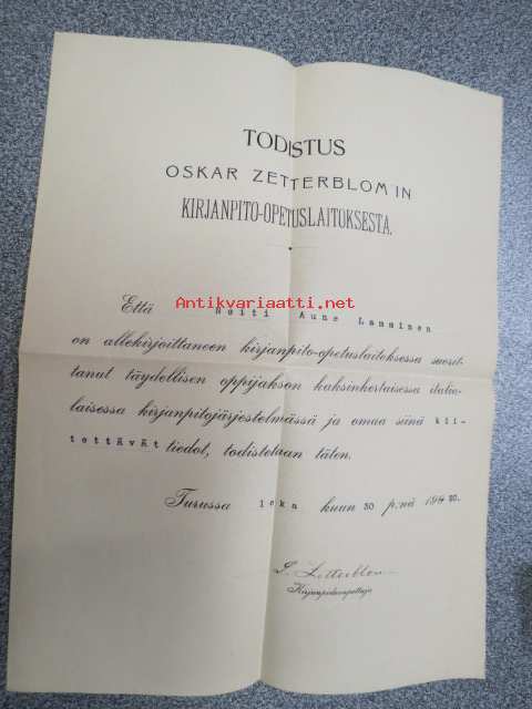 Todistus Oskar Zetterblomin Kirjanpito-opetuslaitoksesta, että neiti Aune Lamminen...