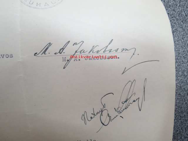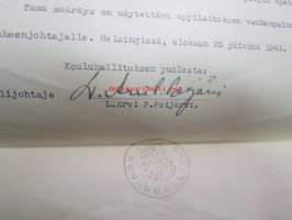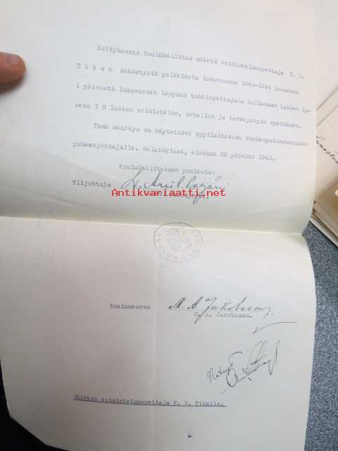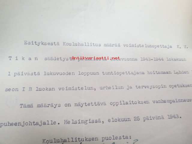 Kouluhallituksen määräys voimistelunopettaja K.V. Tikan palkkiosta... Lahden Lyseon..., Helsinki 25.7.1943, allekirjoitus Kouluhallituksen ylijhohtaja L. Arvi P.