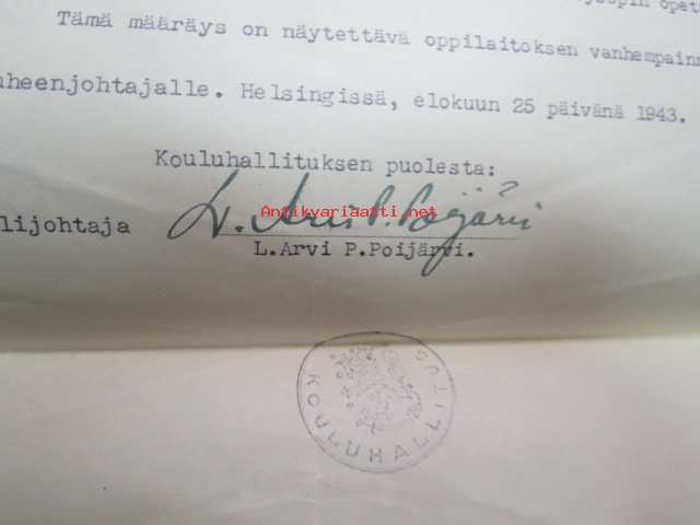 Kouluhallituksen määräys voimistelunopettaja K.V. Tikan palkkiosta... Lahden Lyseon..., Helsinki 25.7.1943, allekirjoitus Kouluhallituksen ylijhohtaja L. Arvi P. Poijärvi