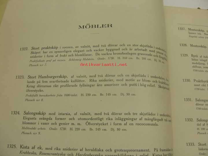 Huutokauppaa varten painettu luettelo. 18 planssia eli sivua kuvitusta.