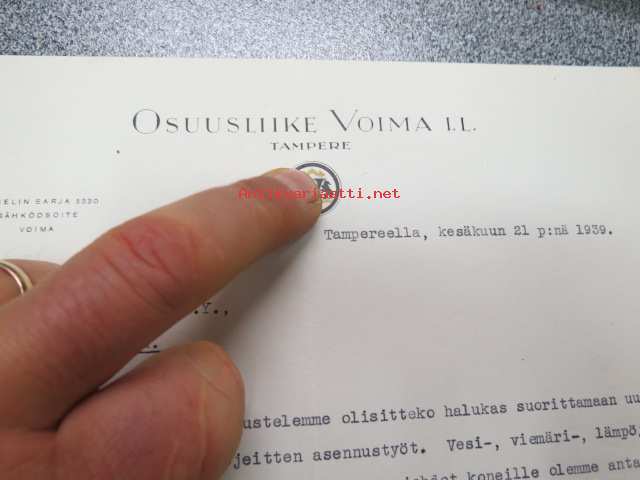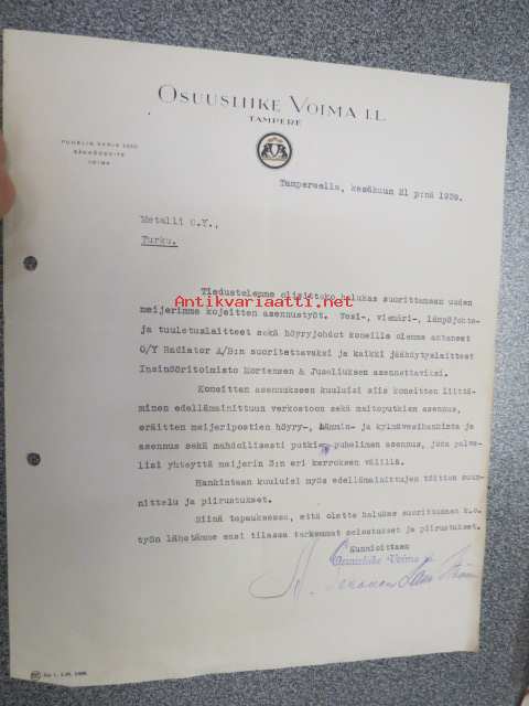 Osuusliike Voima I.L. Tampere, 21.6.1939 -asiakirja
