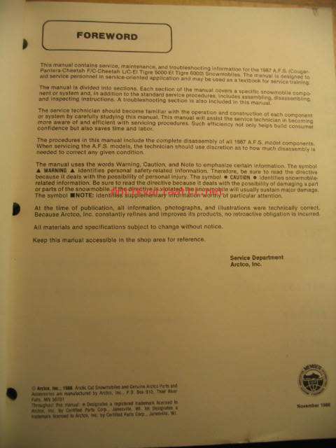 Arctic Cat 1987 Snowmobile AFS Models El Tigre - Pantera - Cougar - Cheetah Service Manual moottorikelkka korjaamokäsikirja