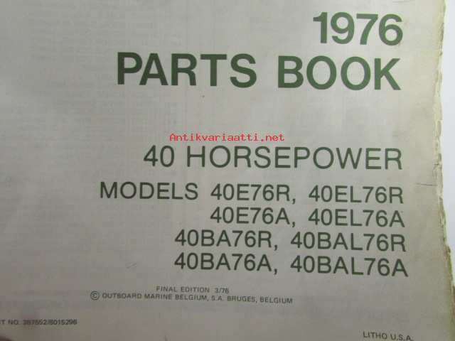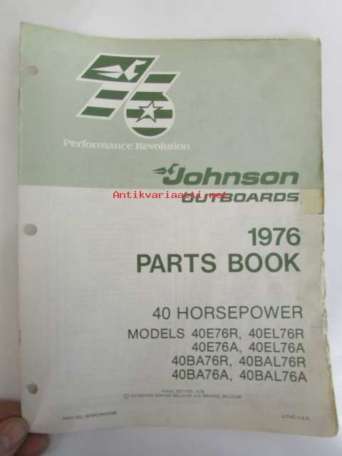 Johnson 40 hp 1976 Parts book models 40E76R, 40EL76R, 40E76A, 40EL76A, 40BA76R, 40BAL76R, 40BA76A, 40BAL76A.
