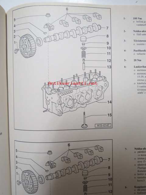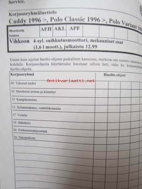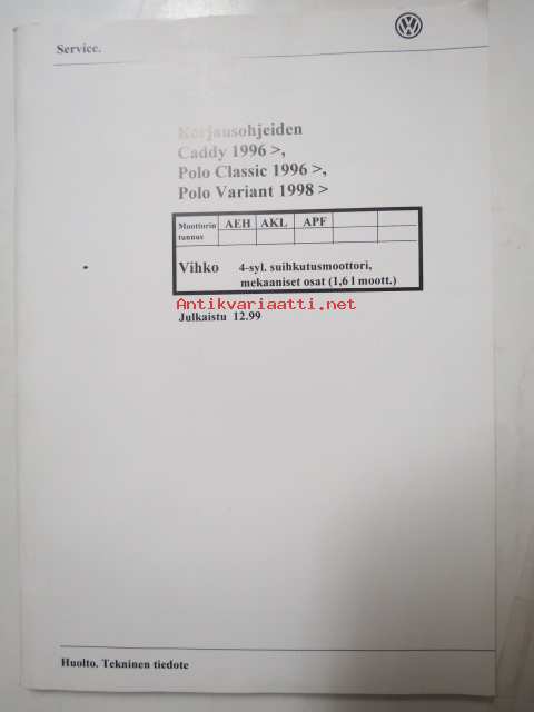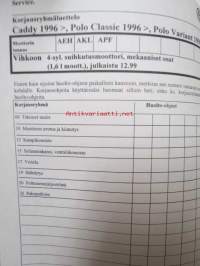 Korjausohjeiden Volkswagen Caddy 1996> Polo Classic 1996>, Polo Variant 1998>, 4-syl.suihkutusmoottori- ja mekaaniset osat (1.6 L MOOTT., moottorin tunnukset AEH, AKL, APF.