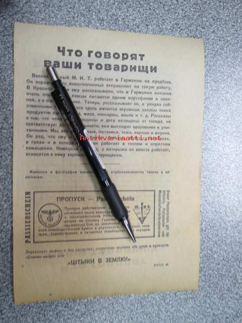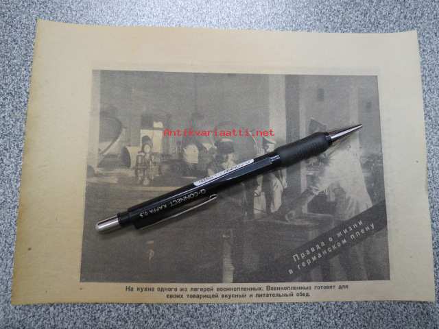WehrmachtNa kuhne odnovo is lagerei voennoplennih... - Erään vankileirin keittiöstä... -saksalaisten lentolehtinen venäläisille, II maailmansota, Pohjois-Suomen rintama, Kiestingin läheltä löytyneestä suutariksi jääneestä kranaatista löytynestä erästä peräisin! 15 x 20 cm.