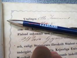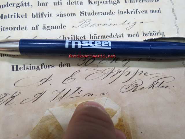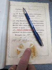 "Ynglingen Otto Immanuel Appelberg som till Kejserliga Alexanders-Universitetet i Finland ankommit med vittnesbörd från Wasa Gymnasium...blifvit såsom Studerande inskrifven... med behörig underskrift och Universitetets Sigill bekräftas Helsingfors 30 Maj 1866 -yliopistoon kirjaaminen