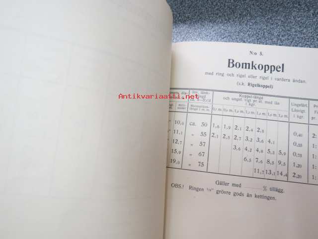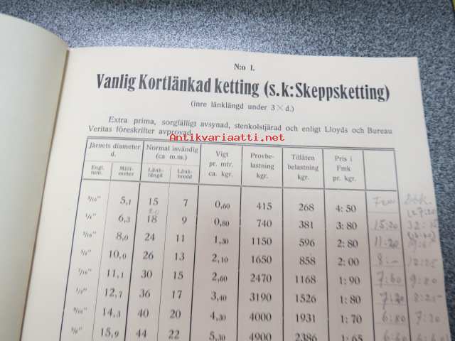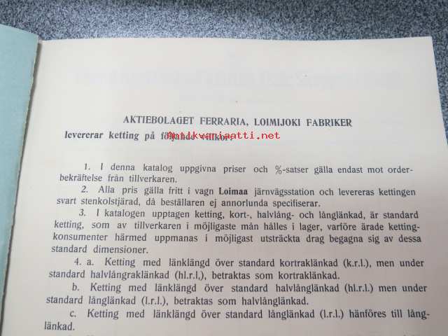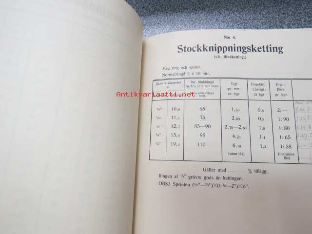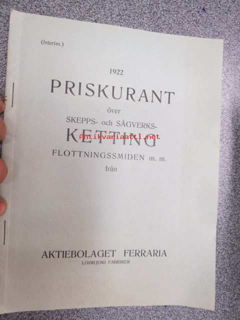1922 Priskurant över Skepps- och sågverksketting, flottningssmiden m.m. från Aktiebolaget Ferraria - Loimijoki Fabriker - tuoteluettelo kettingeistä
