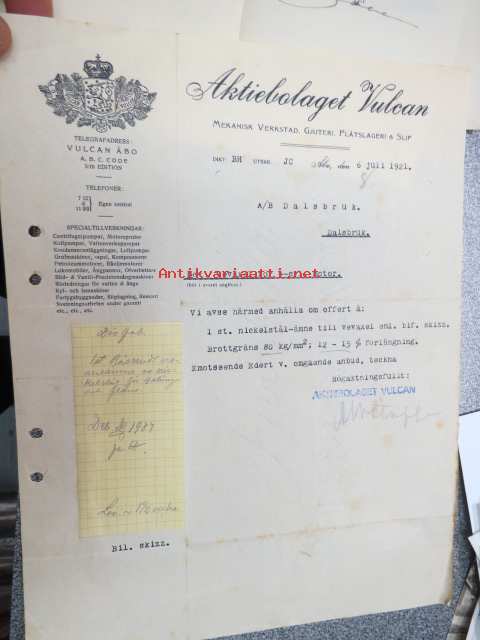 Aktiebolag Vulcan, Turku / Åbo 6.6.1921 -asiakirja