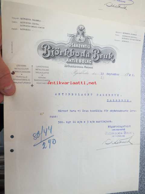 Björkboda Bruk Ab 13.9.1921 -asiakirja