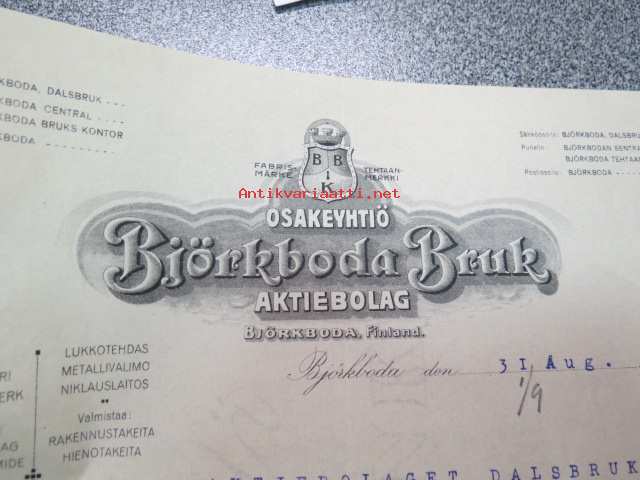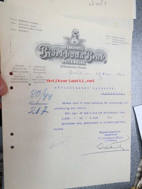 Björkboda Bruk Ab 31.8.1921 -asiakirja