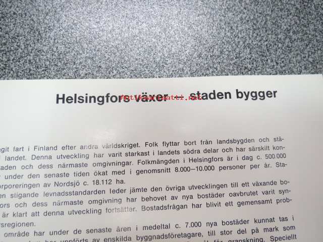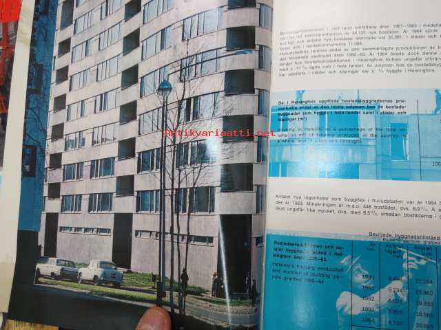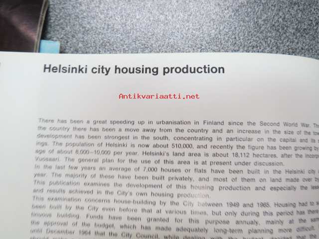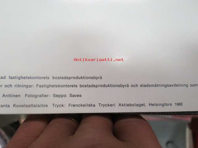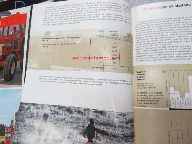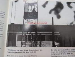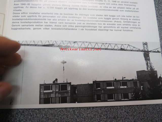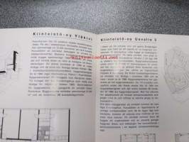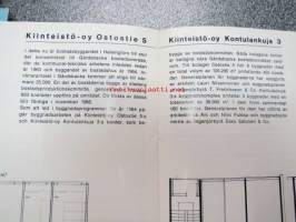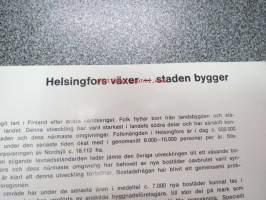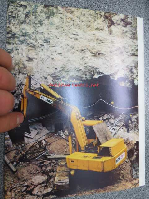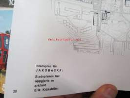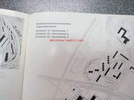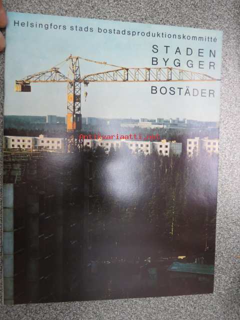 Helsingfors stads bostadsproduktionskommitté - Satden bygger bostäder -esite mm. Gårdsbacka (Kontula) - Ostostie 5, Kontulankuja 3, Kvarnbäcken -Yläkivi, Malm - Usvatie 3, Jakobacka (takakansikuva Hymas Hy-Mac 580 kaivinkone)