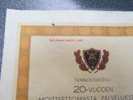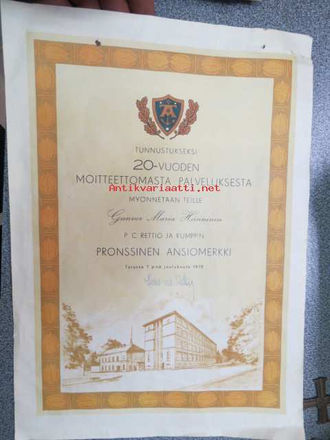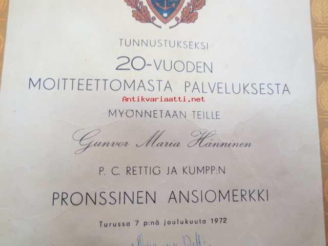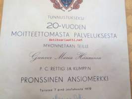 P.C. Rettig - 20-vuotta palveluksessa -pronssinen ansiomerkin myöntökirja