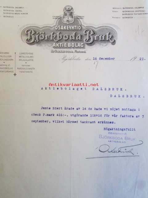 Osakeyhtiö Björkboda Fabriks Aktiebolag Björkboda Finland. 28 november 1921