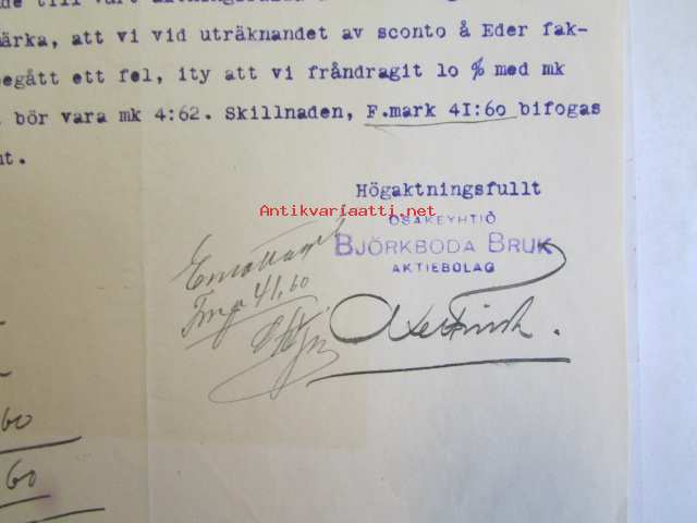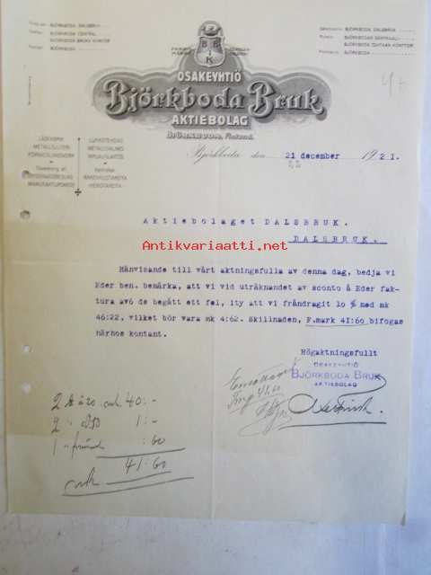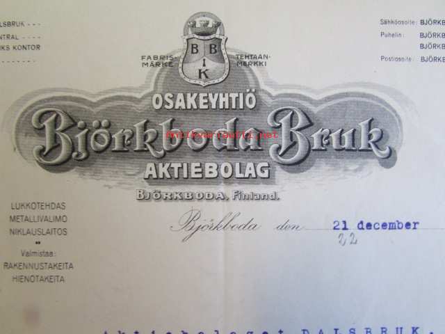 Osakeyhtiö Björkboda Fabriks Aktiebolag Björkboda Finland. 21 december 1921