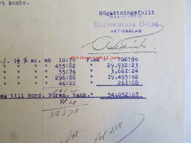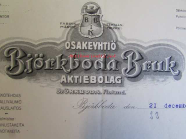 Osakeyhtiö Björkboda Fabriks Aktiebolag Björkboda Finland. 21 december 1921 Kuitti