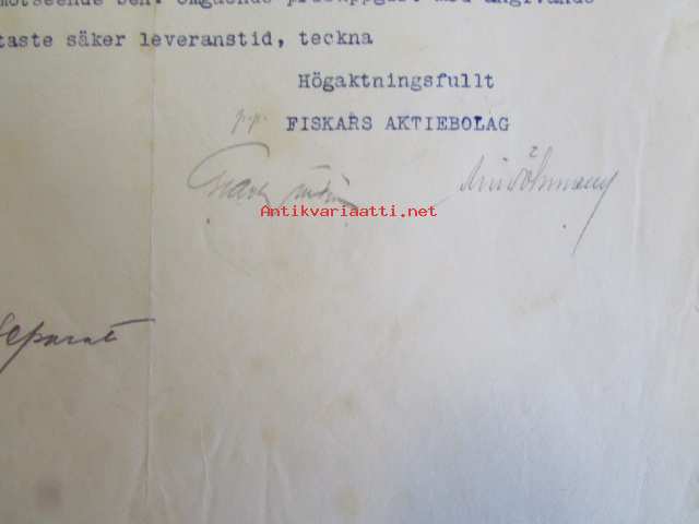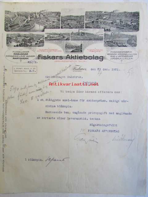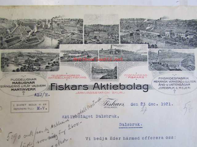 Fiskars Aktiebolaget, tarjous, 23 decemberr 1921 -asiakirja