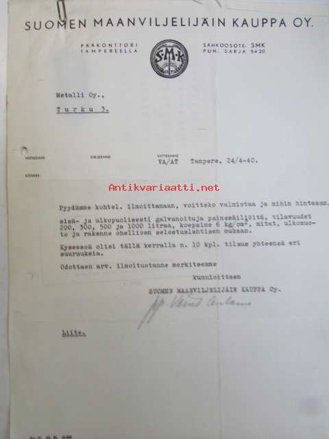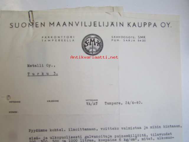 Suomen Maanviljelijäin kauppa OY. Tampere 24/4-40 -asiakirja