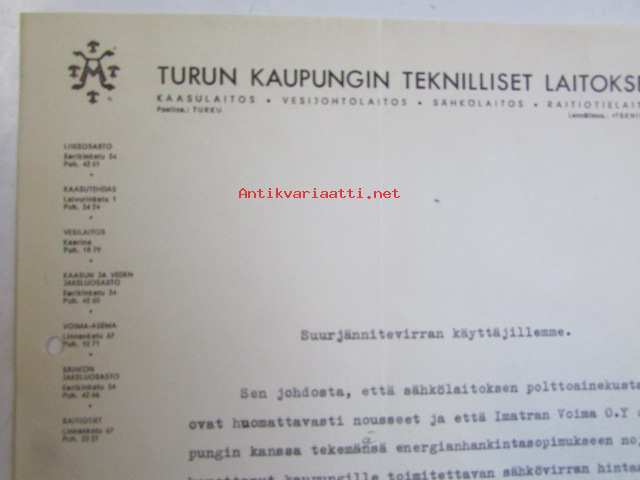 Turun Kaupungin Teknilliset Laitokset Lokakuun 29. 1940 -asiakirja