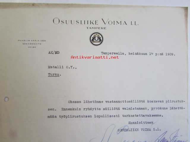 Osuusliike Voima I.L Tampereella, heinäkuun 10. 1939 -asiakirja