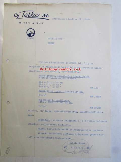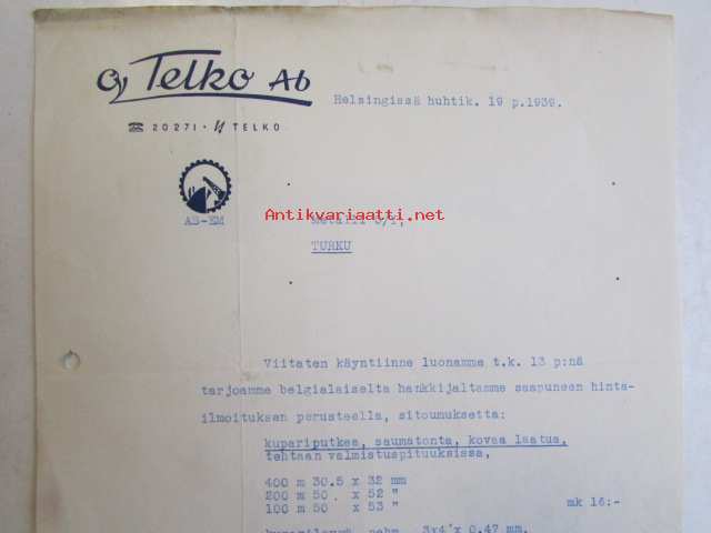 Oy Telko Ab Helsingissä huhtik.19 1939 -asiakirja
