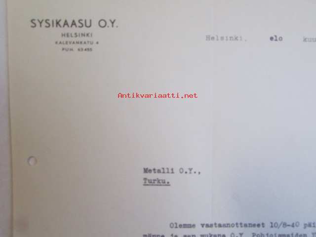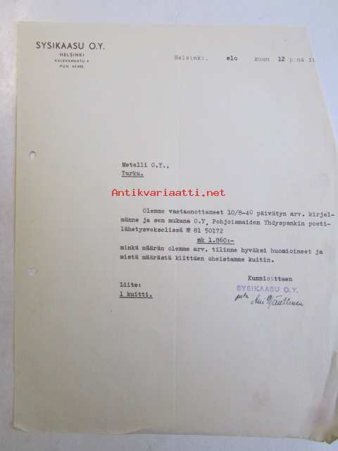 Sysikaasu O.Y. Helsinki, elokuun 12. 1940 -asiakirja kuitti