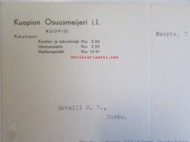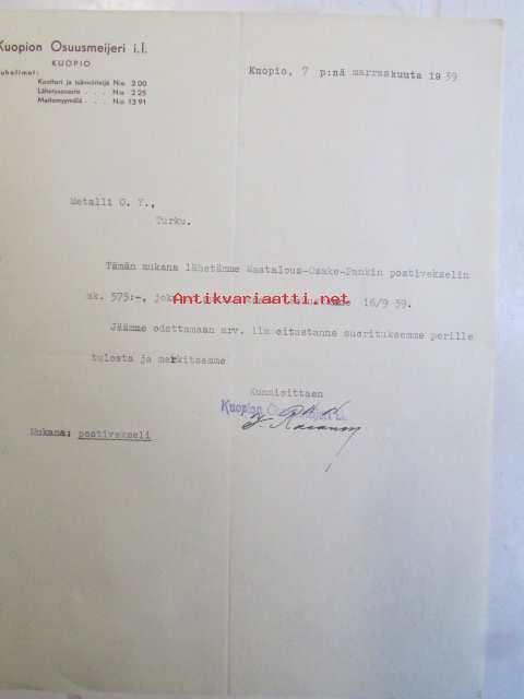 Kuopion Osuusmeijeri, Kuopiossa marraskuun 7. 1939 -asiakirja