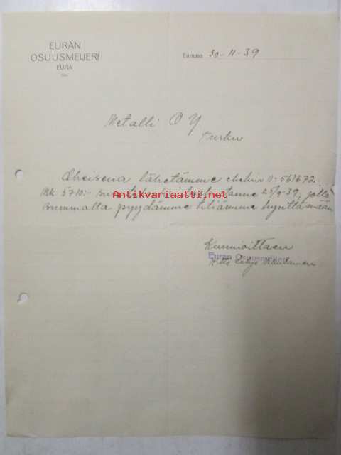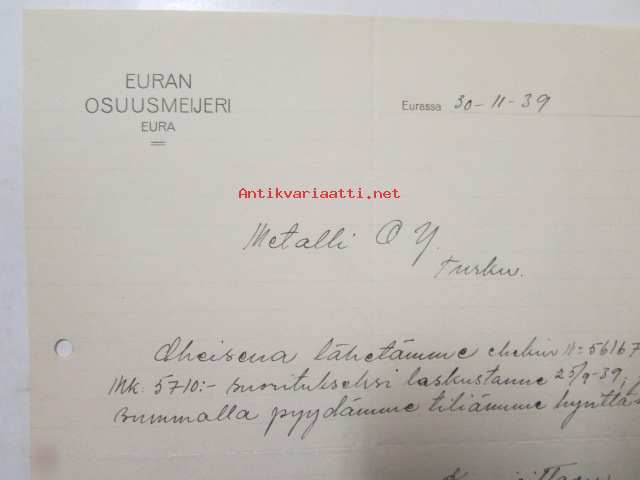 Euran Osuusmeijeri, Eurassa 30-11-39. -asiakirja