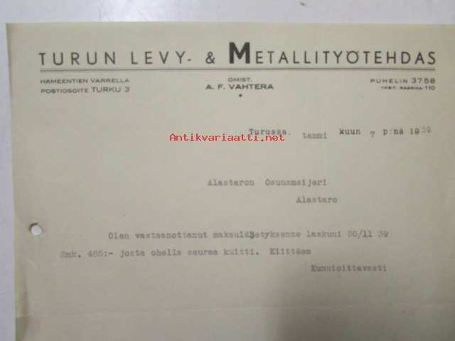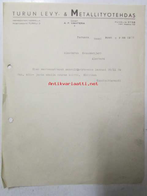 Turun Levy- & Metallityötehdas, Turussa tammikuun 7. 1930. -asiakirja