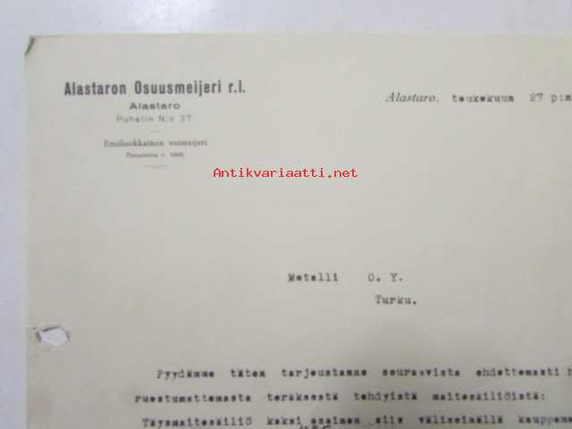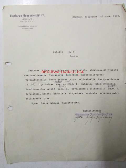 Alastaron Osuusmeijeri r .l., Alastaro toukokuuta 27. 1939. -asiakirja