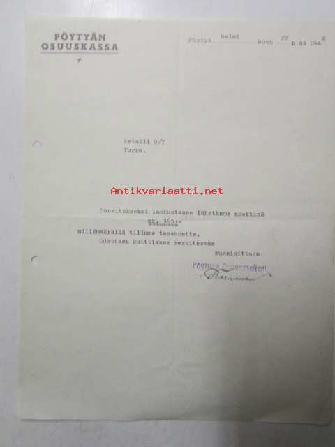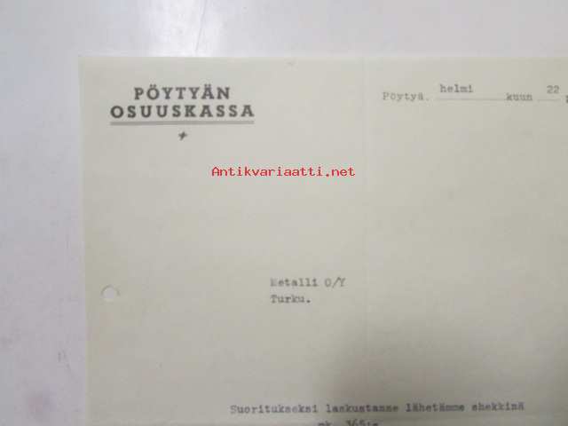 Pöytyän Osuuskassa, Pöytyä helmikuun 22. 1946 -asiakirja