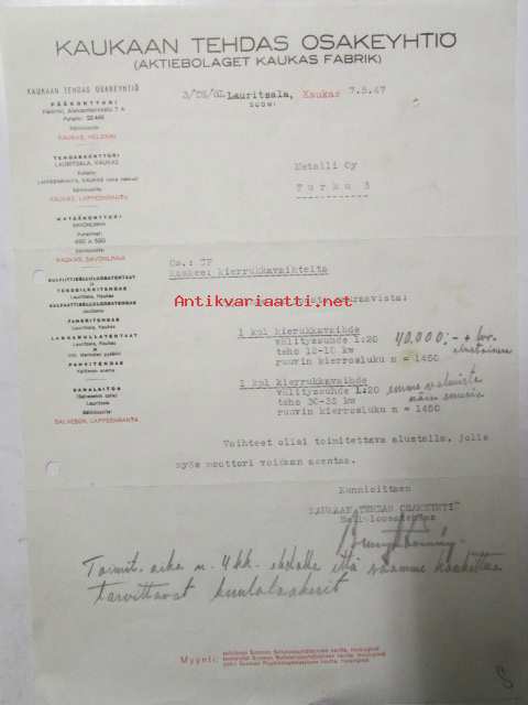 Kaukaan Tehdas Osakeyhtiö, Lauritsala Kaukas 7.5.47 -asiakirja