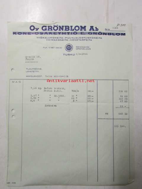 Oy Grönholm Ab, Turku 2/6. 1944 - asiakirja
