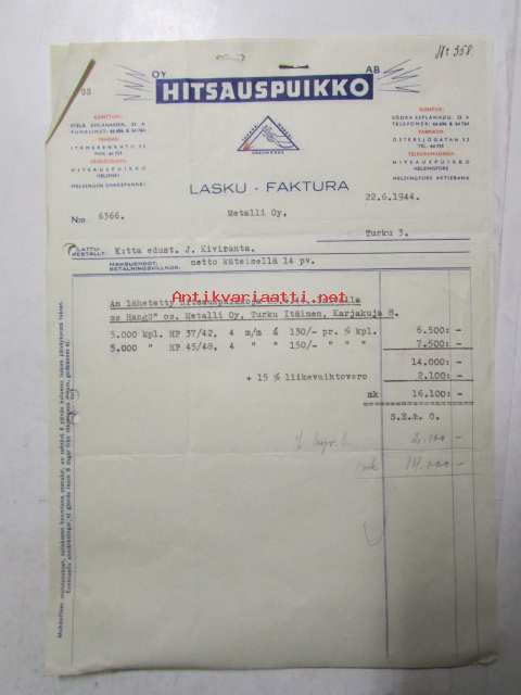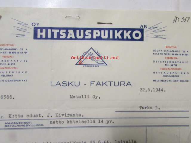OY Hitsauspuikko AB, Turku 22.6.1944 - asiakirja