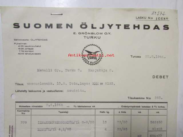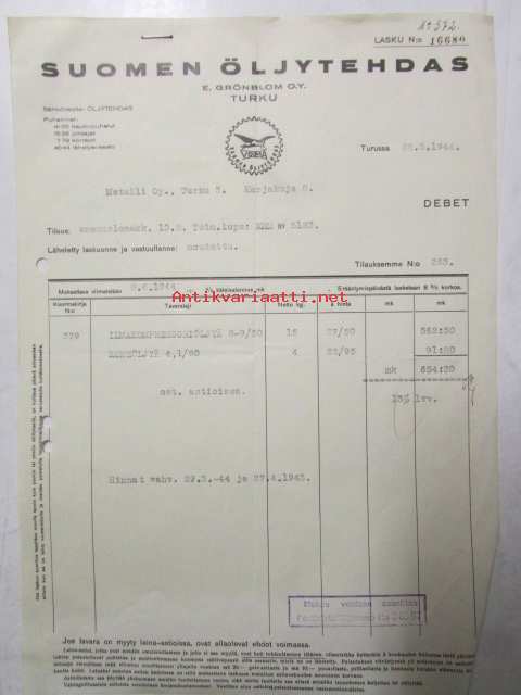Suomen Öljytehdas E.Grönholm O.Y. Turku 25.4.1944 - asiakirja