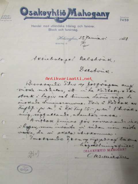 Osakeyhtiö Mahogany, Helsingfors 25. januari 1920. -asiakirja