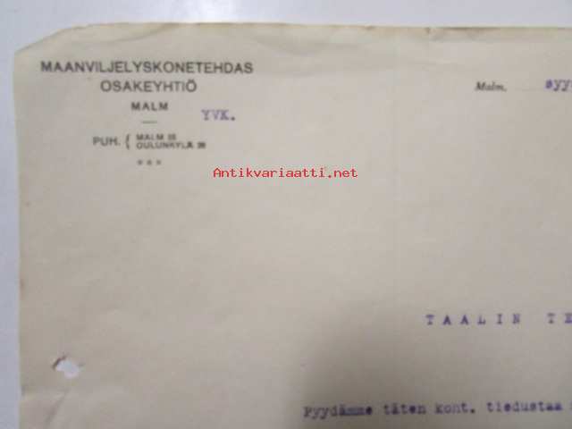 Maanviljelyskonetehdas Osakeyhtiö, Malm, syyskuun 2. 1921 -asiakirja