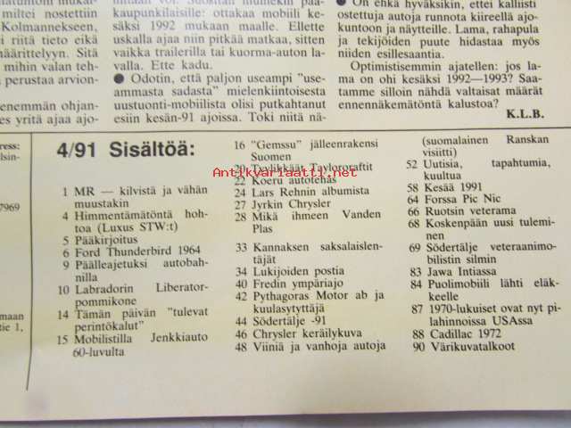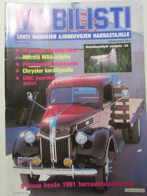 Mobilisti 1991 nr 4 -Lehti vanhojen autojen harrastajille, sisällysluettelo löytyy kuvista.