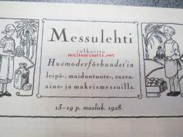 Messulehti julkaistu Husmoderförbundet´in leipä-, maidontuote-, rasva-aine- ja makeismessuilla 13-19 p. maaliskuuta 1928 - Mässbladet utgiven vid